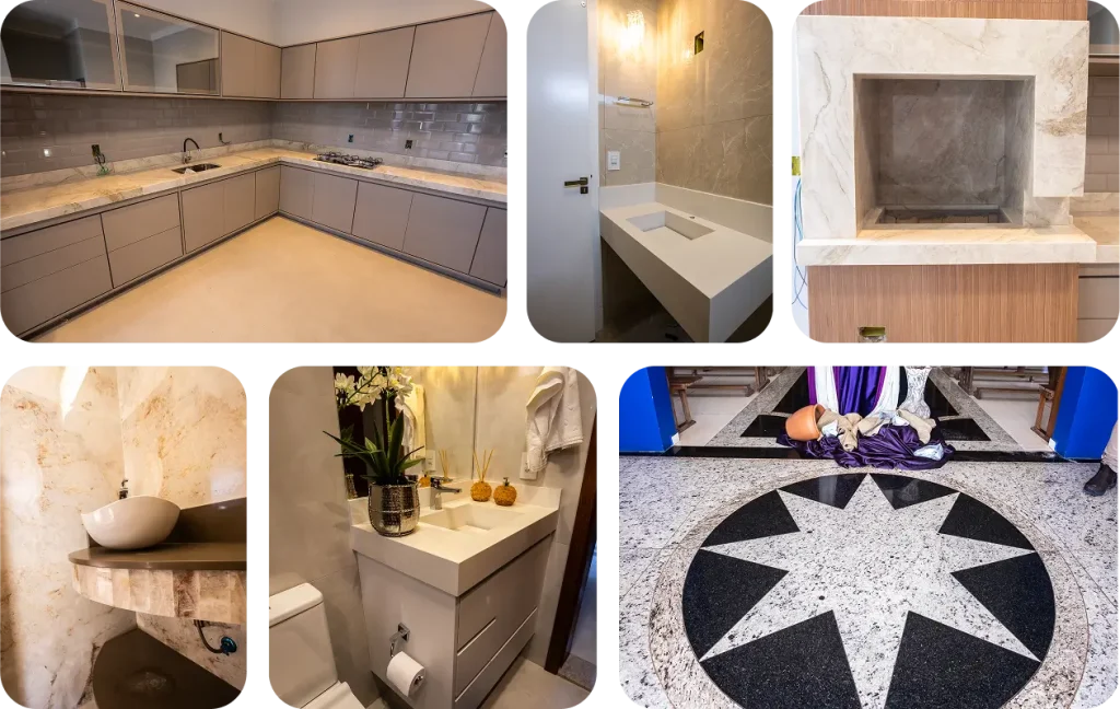 Trabalhamos com os melhores materiais do mercado, incluindo Quartzitos, Granitos exóticos e Mármores Dolomíticos.